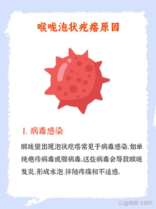 - 流感或普通感冒:这些病毒也可能导致喉咙痛,有时口腔内也会因炎症出现小红点或溃疡,但水泡不如前几种典型。