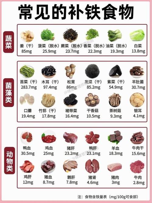 - 黑木耳、紫菜:干品的铁含量尤其惊人。