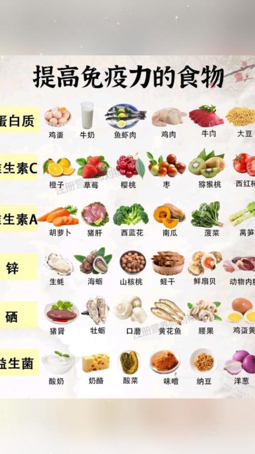 | 蔬菜 | 西兰花、菠菜、彩椒、蘑菇 | 富含VA、VC、锌和硒,全面增强免疫力 |