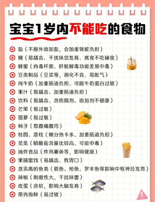 (图片来源网络,侵删)- 为什么不能吃: 这类食物(如炸鸡、薯条、肥肉、奶油蛋糕等)非常难以消化,会加重宝宝肠胃的负担,可能导致消化不良、腹泻,甚至加重病情。