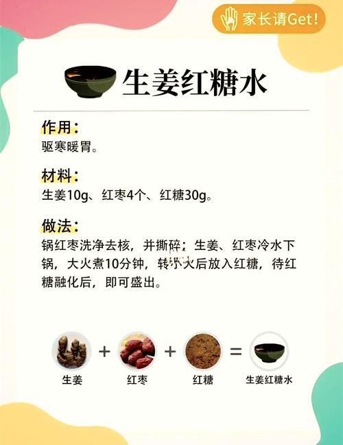 - 生姜:具有驱寒发汗、暖胃的作用,可以煮一杯红糖姜茶(趁热喝),对缓解风寒感冒初期症状有帮助。