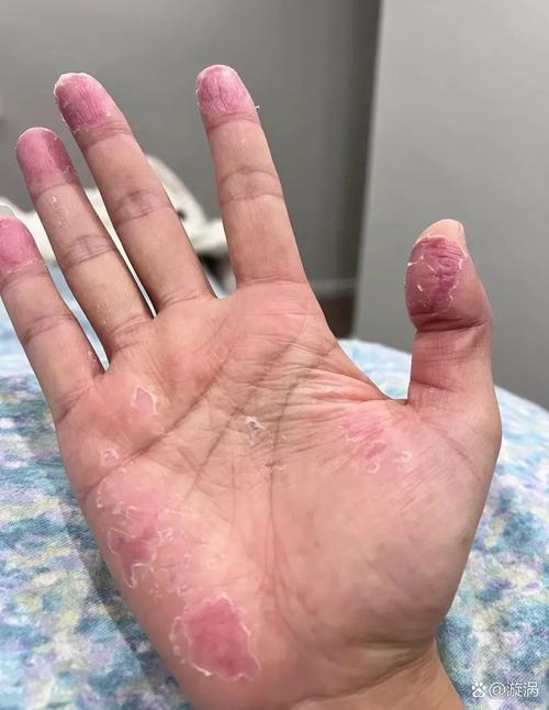 - 银屑病(牛皮癣):也可能影响手掌,导致皮肤增厚、出现红色斑块和鳞屑,伴有瘙痒或疼痛。