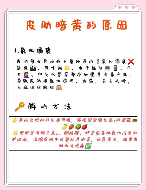 - 原因:随着年龄增长,皮肤的新陈代谢速度减慢,黑色素更容易沉积,胶原蛋白和弹性纤维流失,皮肤变薄、失去支撑,透出皮下脂肪的淡黄色,同时也会显得暗沉。
