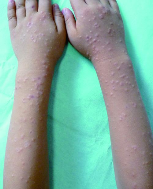 - 外观: 全身成批出现红色斑丘疹、水疱和结痂,这三种皮损可以同时存在,是水痘的典型特征。