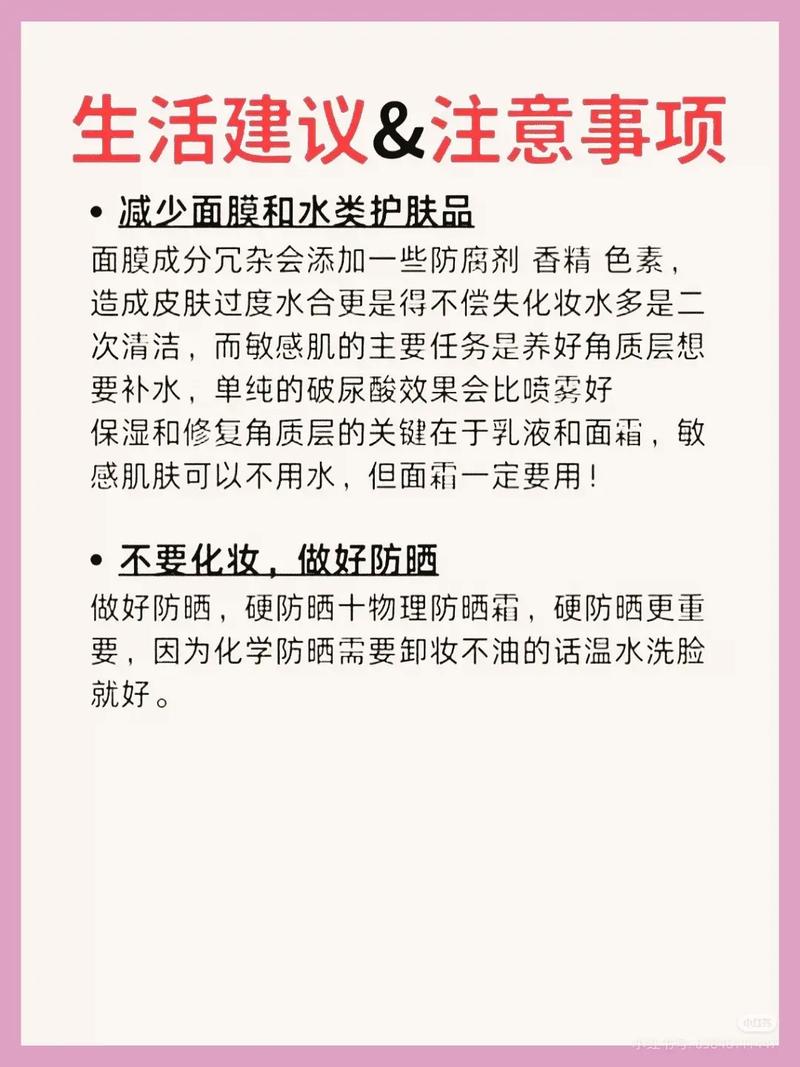 - 选择成分简单、无香精、无酒精、无色素的医用修复敷料或面霜。
