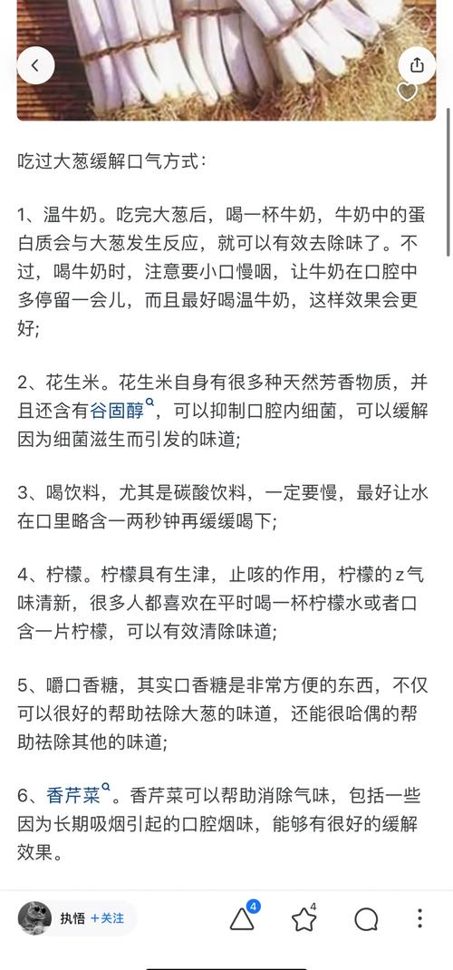 - 方法:吃完大葱后,喝一小杯牛奶或吃几口酸奶,含在嘴里漱几下再咽下,效果最佳。