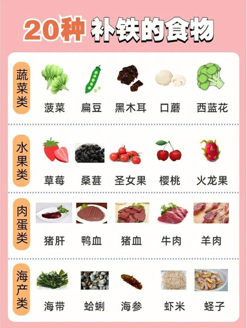 - 注意: 植物性铁的吸收率较低(约2%-20%),但它们也是重要的铁来源,且富含膳食纤维、叶酸等其他营养素。