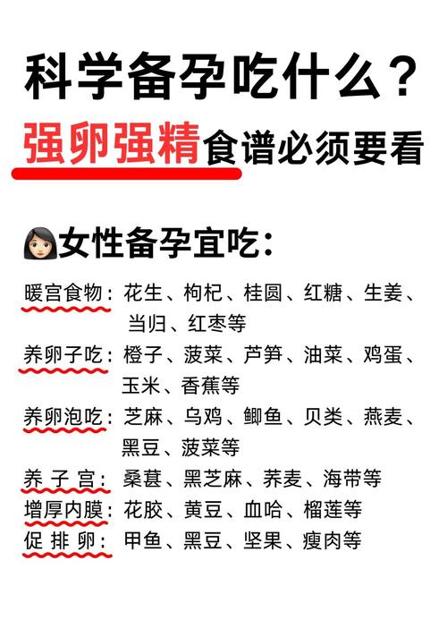 - 优质蛋白: 鱼、禽、蛋、奶、豆制品都是优质蛋白的来源,有助于卵子和精子的质量。