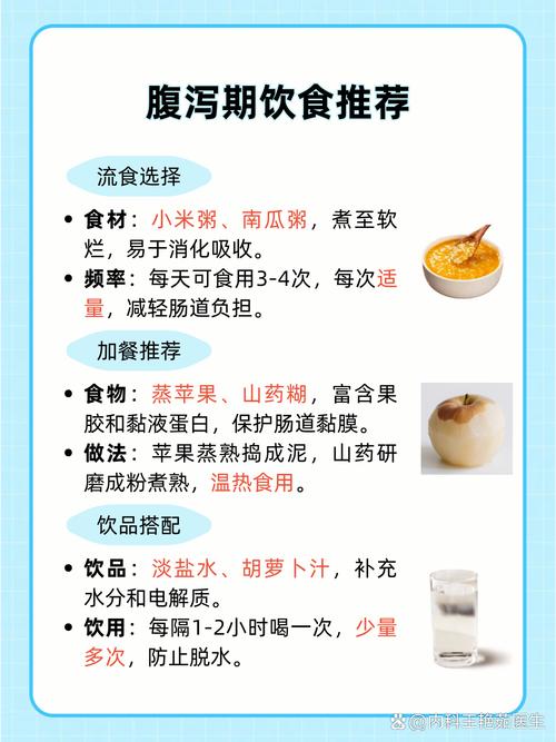 - 推荐: 白粥、烂面条、馒头、苏打饼干、蒸蛋羹、去皮的苹果泥、香蕉等。