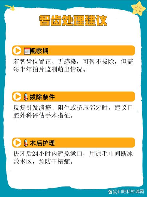 - 给出专业建议:根据智齿的位置、方向、与邻牙的关系以及你的症状,牙医会给出最合适的建议。