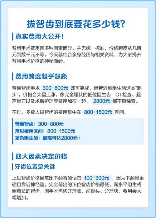 - 拍片费用:拔除复杂牙齿前,通常需要拍曲面断层片(全景片),费用在100-150元左右,有时可能还需要CBCT(三维锥形束CT),费用更高,约200-500元,用于精确判断牙齿与神经管的位置关系。