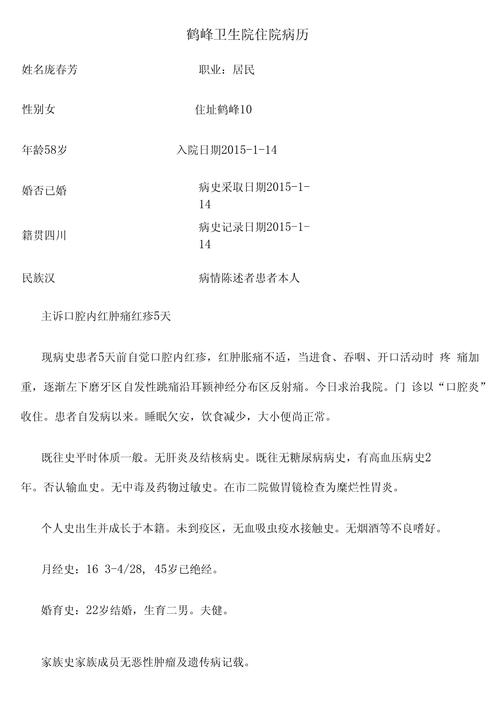 下面我将从基本结构、关键要素、不同类型示例以及书写要点四个方面,为您详细拆解口腔溃疡病历的写法。