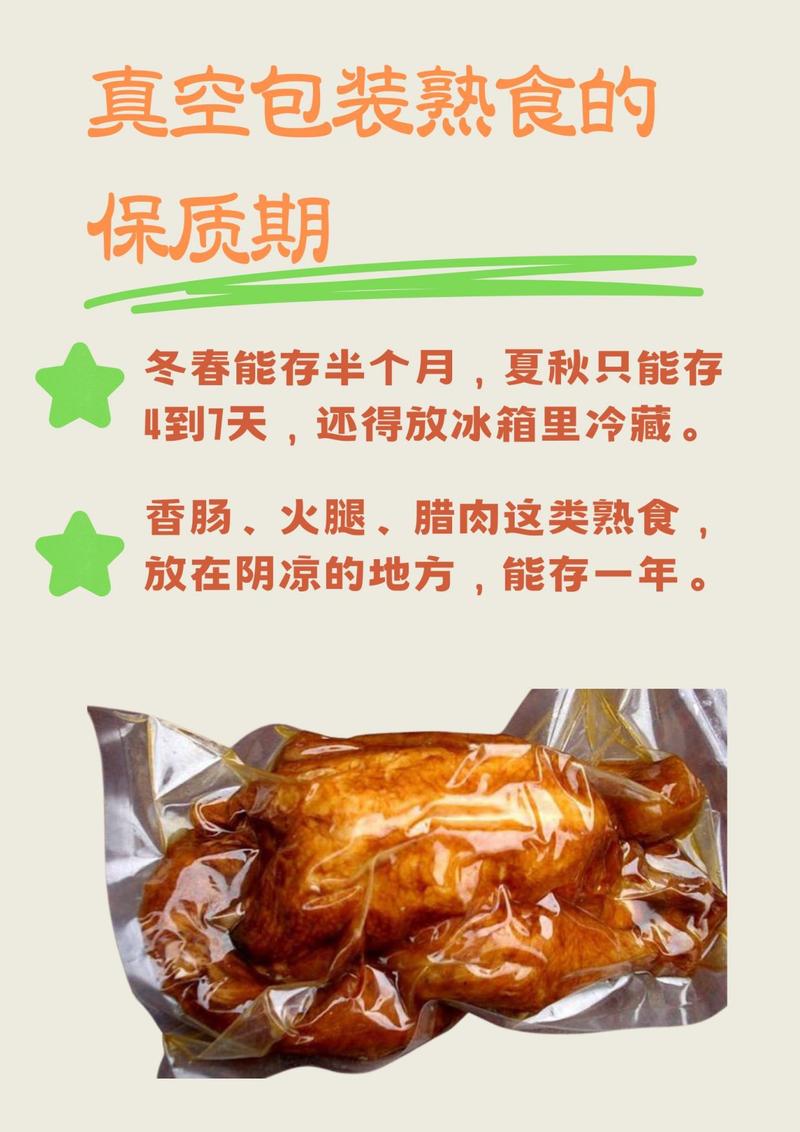 | 熟肉、熟食 | 5 - 7 天 | 2 - 6 个月 | 冷冻后解冻再加热需彻底。 |