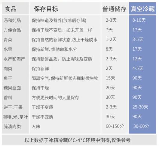 下面我将根据不同的储存方式,为您详细列出各类食物的大致保存时间。