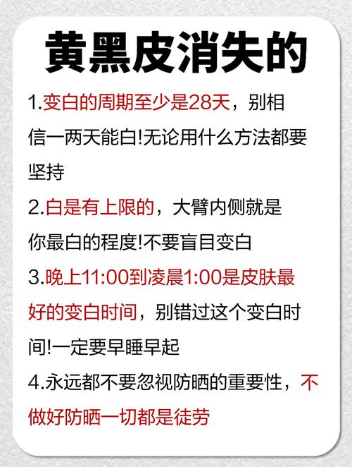 - 保证充足睡眠: “美容觉”是真的!晚上10点到凌晨2点是皮肤修复的黄金时间,熬夜会让肤色蜡黄、长斑。