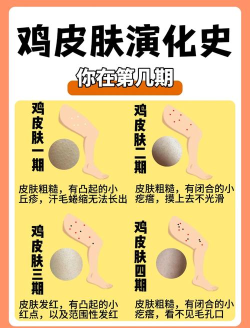 - 颜色变淡:鸡皮肤常伴随的泛红或褐色印记会随着治疗逐渐淡化。