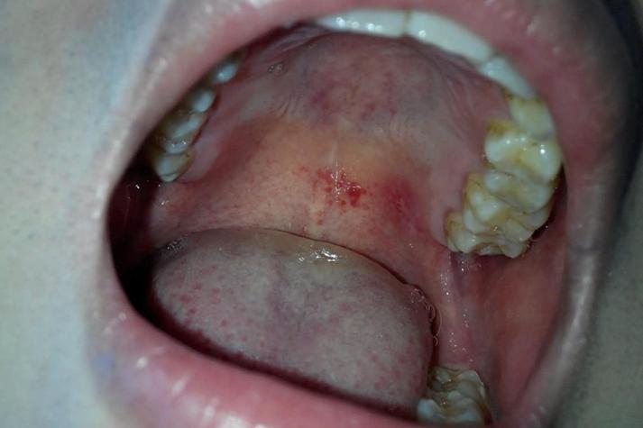 (图片来源网络,侵删)- 疱疹性口炎:由单纯疱疹病毒引起,初期可能在口腔任何部位(包括上颚)出现成簇的小水疱,很快会破溃形成小溃疡,伴有疼痛、灼热感和发热。
