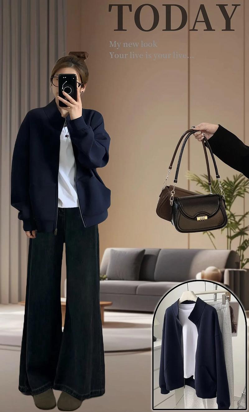 - 选择:藏青色针织衫 + 高腰直筒裤,温柔又干练。