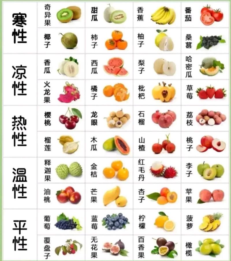- 榴莲:性热,味辛甘,是水果中温性很强的,有滋阴强壮、疏风清热、利肠健胃的功效,但热量高,易上火。