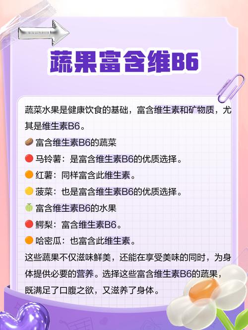 含维生素b6的食物和水果蔬菜 维生素B6(又称吡哆醇)是一种水溶性维生素,对人体至关重要,它参与体内上百种酶促反应,尤其在蛋白质代谢、神经系统功能、血红蛋白生成以及免疫功能方面扮演着核心角色。(图片来源网络,侵删) 长期缺乏可能导致皮肤炎症、舌炎、贫血、抑郁、免疫力下降等问题。 维生素B6含量极高的食物(“王者”级别) 如果您需...