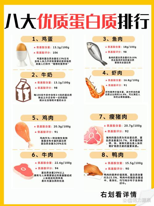 哪些常见食物富含高蛋白? 高蛋白食物是我们饮食中非常重要的一部分,对于肌肉生长、身体修复、维持饱腹感以及支持免疫系统都至关重要。(图片来源网络,侵删) 以下是常见的高蛋白食物分类,并附上一些具体的例子和蛋白质含量参考,方便您了解和选择。 动物性蛋白(通常为“完全蛋白”,含所有必需氨基酸) 动物性蛋白是许多人首选的蛋白质来源,...